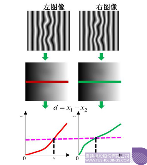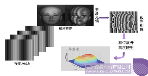 結(jié)構(gòu)光條紋(單幀條紋或相移條紋)投影到被測物體表面,從另一方向觀察到變形條紋,通過計(jì)算變形條紋的相位,得到截?cái)嘞辔唬归_成連續(xù)相位,根據(jù)相位和高度的映射關(guān)系,重建被測物體的三維面形數(shù)據(jù)。