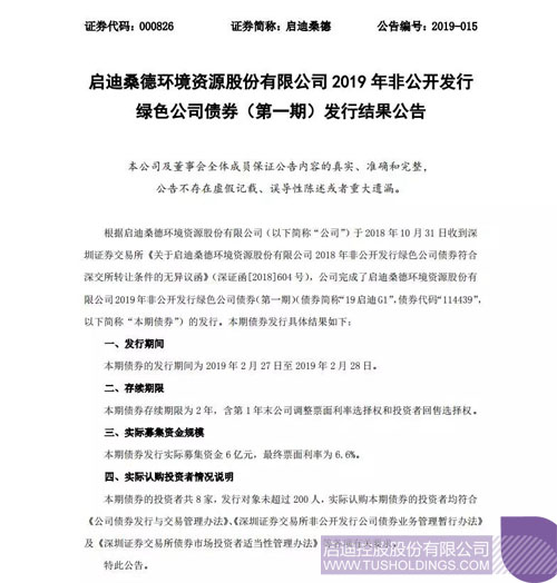 3月1日,啟迪桑德環(huán)境資源股份有限公司完成2019年非公開發(fā)行綠色公司債券(第一期)(債券簡稱“19啟迪G1”,債券代碼“114439”),本期債券的發(fā)行期間為 2019 年 2 月 27 日至 2019 年 2 月 28 日,發(fā)行實際募集資金 6 億元。實際認(rèn)購本期債券的投資者均符合《公司債券發(fā)行與交易管理辦法》、《深圳證券交易所非公開發(fā)行公司債券業(yè)務(wù)管理暫行辦法》及《深圳證券交易所債券市場投資者適當(dāng)性管理辦法》等各項有關(guān)要求。