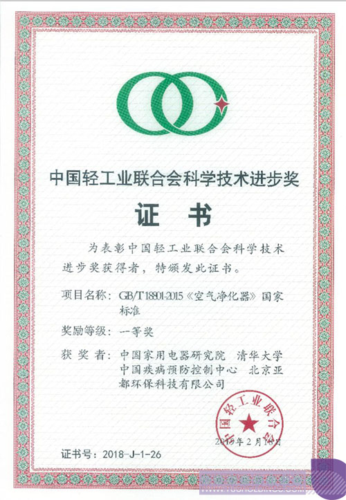 3月21日,中國輕工業(yè)聯(lián)合會四屆五次理事會在廣西南寧舉行。會議表彰了2018年度中國輕工業(yè)聯(lián)合會科學技術(shù)獎的獲獎組織和個人,由啟迪控股成員企業(yè)—亞都、中國家電研究院、清華大學、中國疾控中心聯(lián)合起草制定的“GB/T18801-2015《空氣凈化器》國家標準”項目榮獲2018年度中國輕工業(yè)聯(lián)合會科學技術(shù)進步一等獎,亞都作為該標準的主要起草單位,成為唯一獲得此項獎勵的企業(yè)單位。