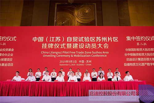 9月1日上午,中國(江蘇)自貿試驗區(qū)蘇州片區(qū)(以下簡稱“蘇州自貿區(qū)”)掛牌儀式暨建設動員大會隆重舉行。江蘇省委常委、蘇州市委書記周乃翔,蘇州市委副書記、市長李亞平為蘇州自貿區(qū)揭牌。大會現(xiàn)場舉行了包括啟迪設計集團新總部大樓在內的32個自貿區(qū)項目集中簽約儀式,啟迪設計集團董事長戴雅萍、總裁查金榮受邀出席掛牌儀式,戴雅萍董事長作為公司代表上臺簽約。