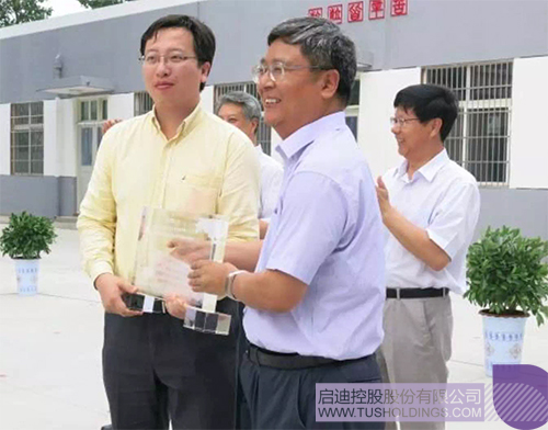 阜寧縣教育局局長蔡衛國向啟迪控股代表贈送“啟迪樓”模型