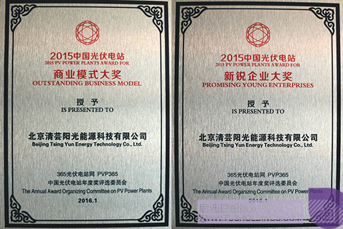 2015年,榮獲“中國(guó)光伏電站新銳企業(yè)大獎(jiǎng)”、“中國(guó)光伏電站商業(yè)模式大獎(jiǎng)”。