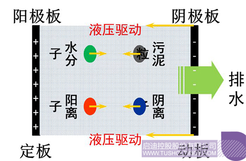 電滲透污泥高干脫水設備由電滲透系統、濾室組件、液壓系統等組成。污泥經進泥泵輸送到濾室,陰、陽極板通電后形成均布電場,在電場作用下,污泥中的帶電粒子分別向陰、陽極板移動,并結合液壓系統帶動板框梯度壓榨,實現污泥脫水。